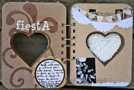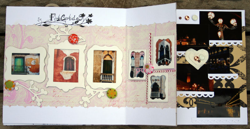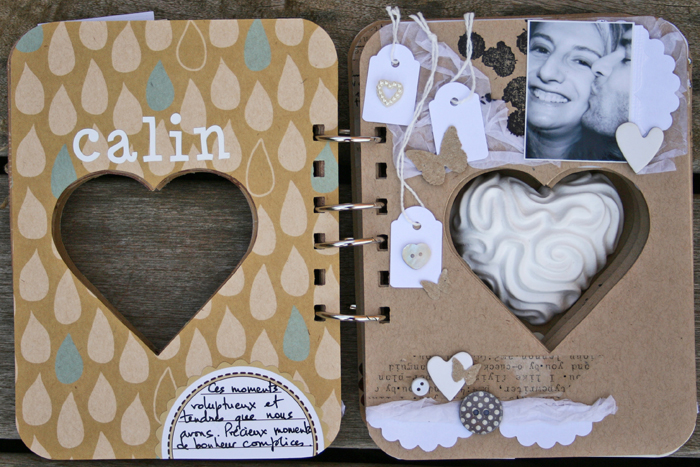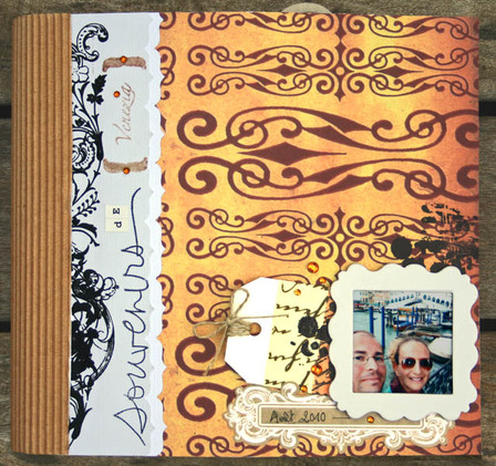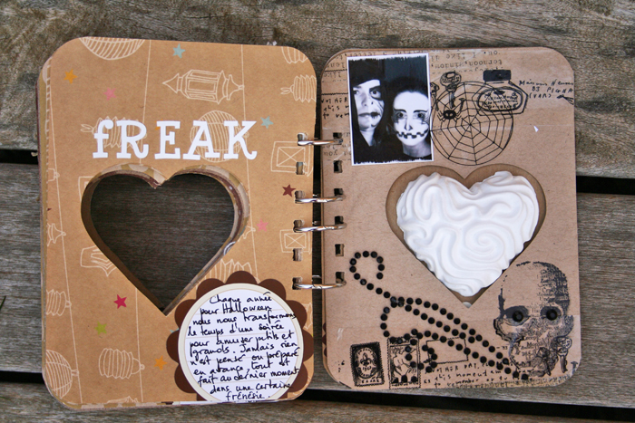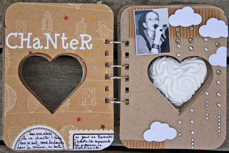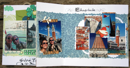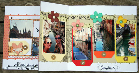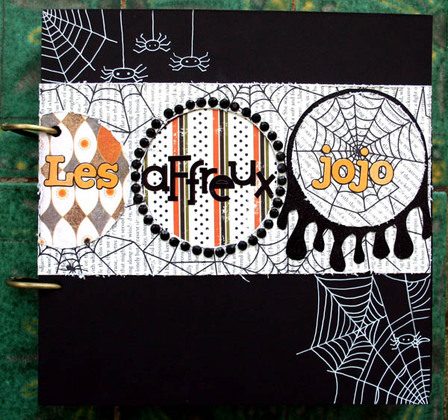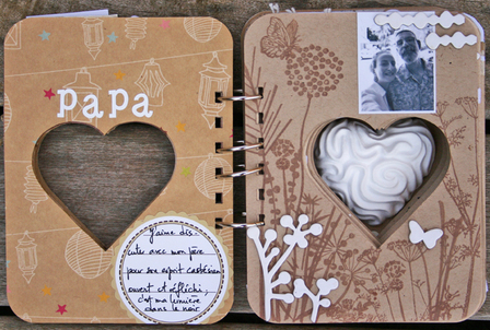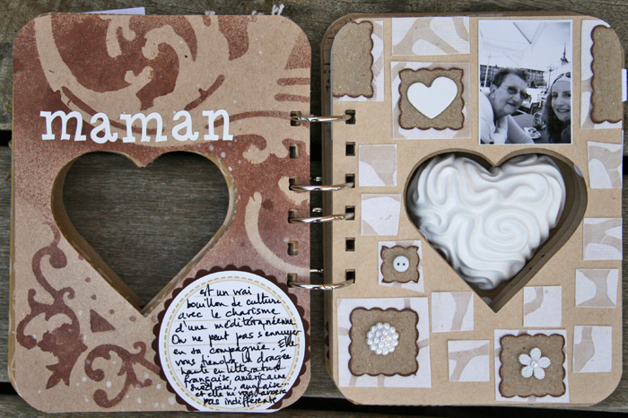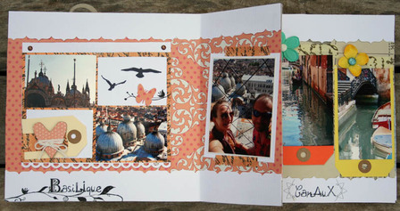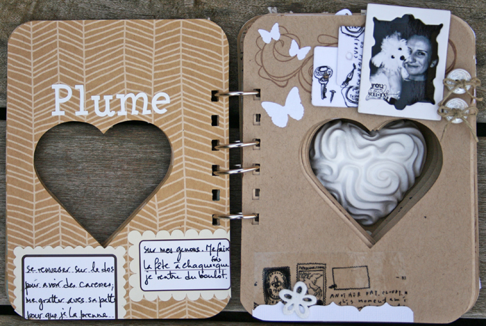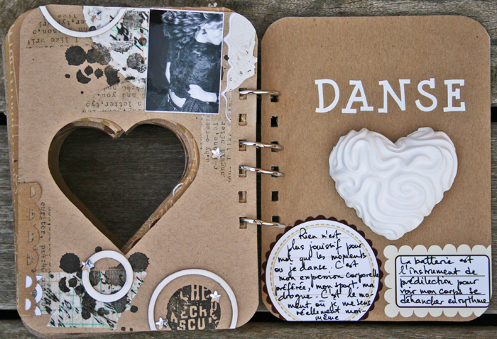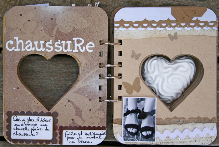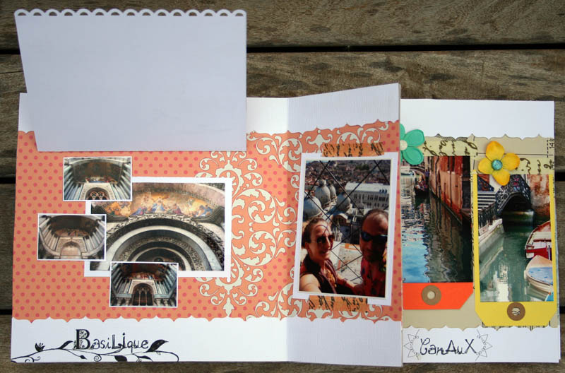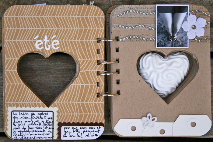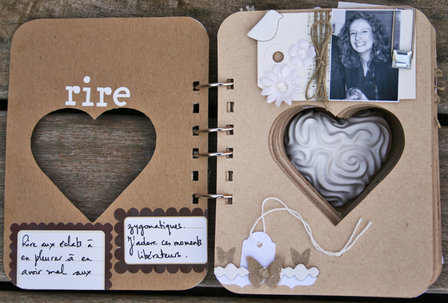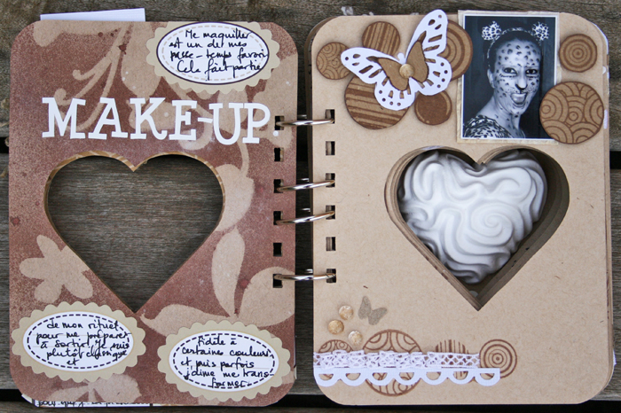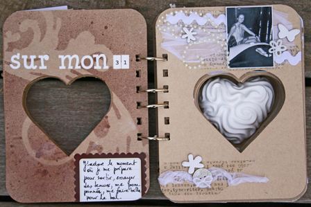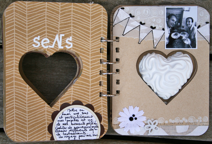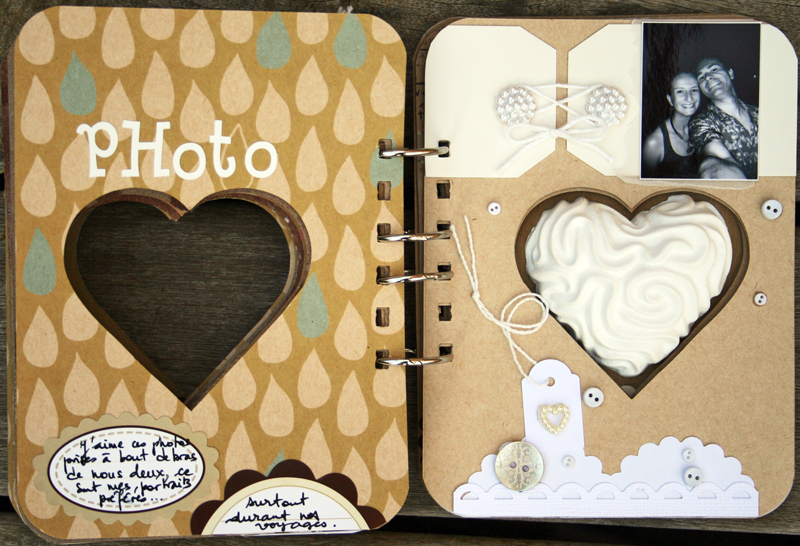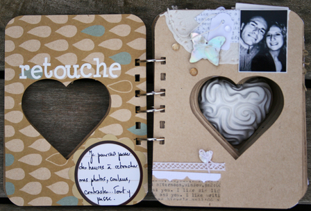 C'est un album narcissique où j'ai utilisées des photos de moi qui sont pour la majorité passées par un logiciel de dessin. C'est un album en papier et je n'avais pas fait de scrapbooking papier depuis un bon moment. Je l'avais délaissé pour le scrap digital qui m'était plus facile à utiliser surtout à cause de mon hernie discale. J'avais donc un peu peur de cette reprise, de ce contact à nouveau avec le papier, du toucher, de ne pas y arriver. J'ai donc préféré faire quelque chose de personnel afin de ne pas bousiller des photos pour rien.