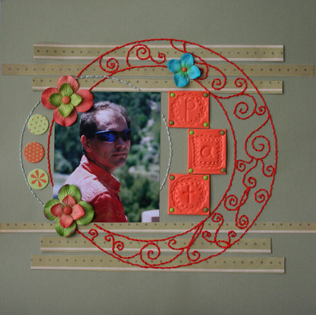 Je n'ai pas choisi une page simple à mon sens, il y avait pas mal de superpositions de papiers et beaucoup de COUTURES. Pour ce faire, j'ai utilisé une photo de mon doudou qui me lance un regard qui me fait craquer ; la couture est faite à la main (j'ai même cassé mon foret en faisant les trous) et le petit texte est de moi. Je pense que le résultat aurait été plus beau et plus fin avec une couture à la machine mais je n'ai pas encore ça en magasin.